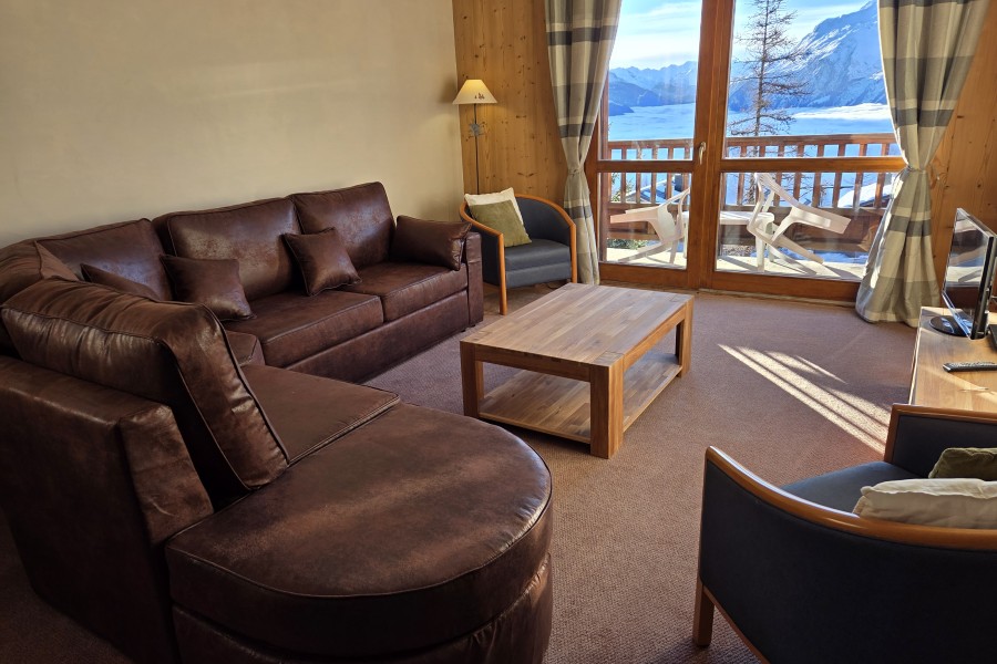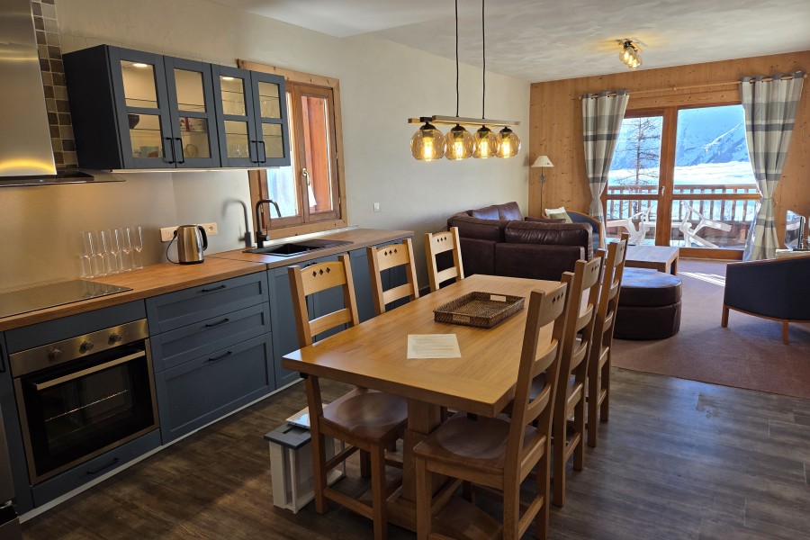 Le séjour et cuisine de 35m2 donne directement sur la Haute Tarentaise face sud et est avec balcon. Cuisine totalement équipée avec lave-vaisselle, four, plaque induction, casseroles. Canapé d'angle pour 8/9 personnes.