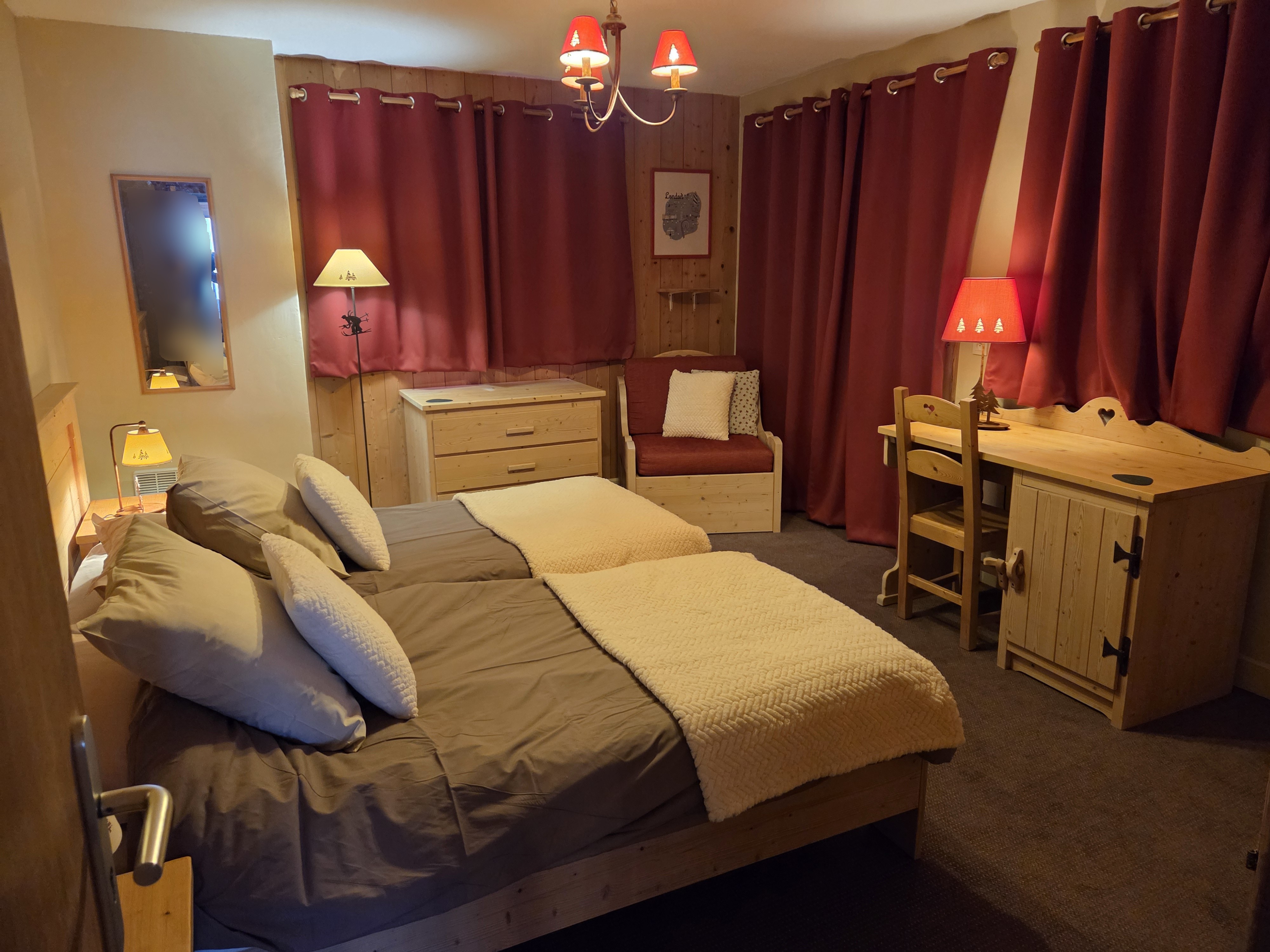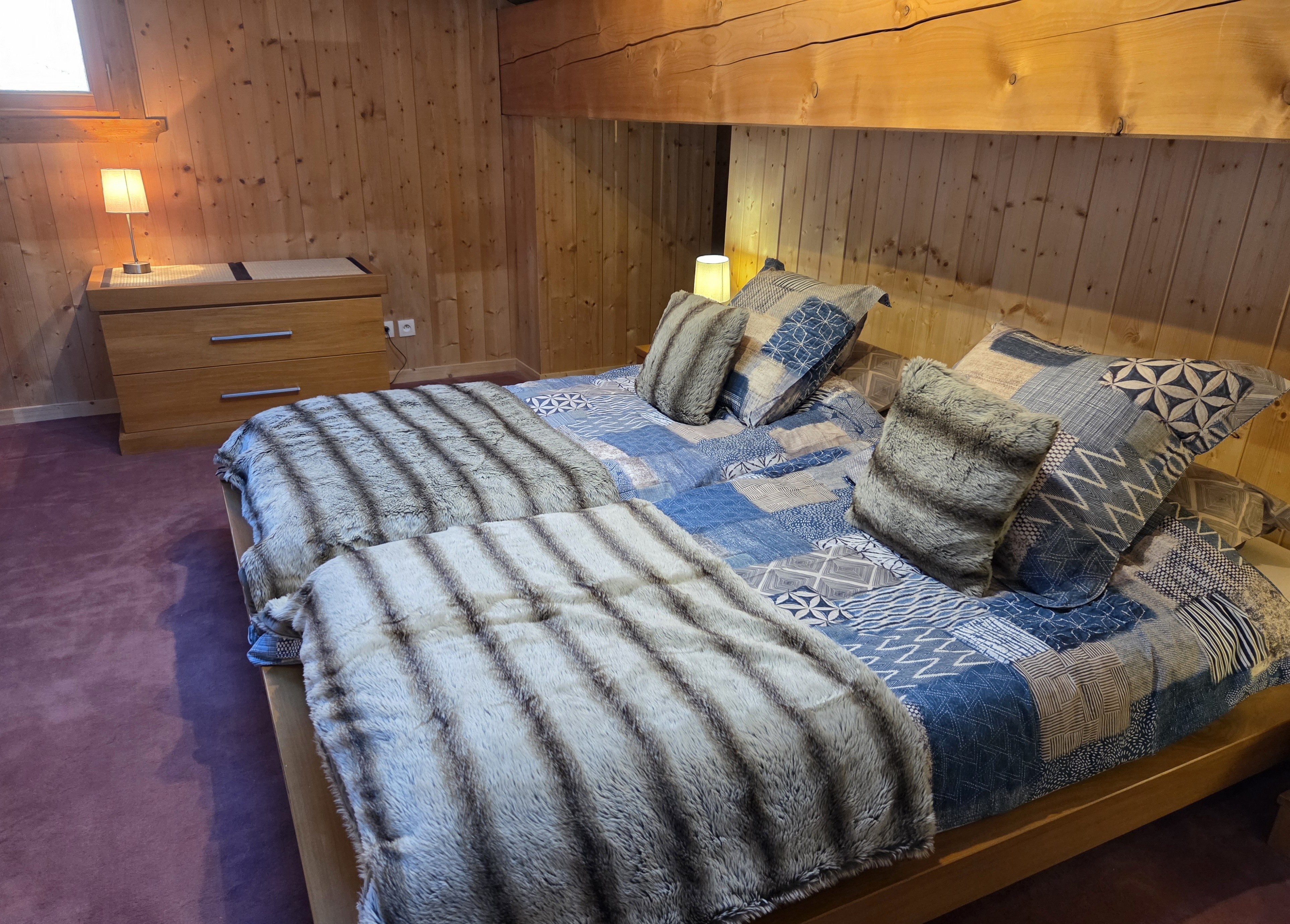 Une chambre principale (lit 160x200cm et lit gigogne 90x190cm), chambres twin (deux lits 90x200cm), chambre familiale mezzanine (lit 180x200cm ou deux lits simple 90x200cm) et coin séjour en bas avec canapé lit (140x200cm).